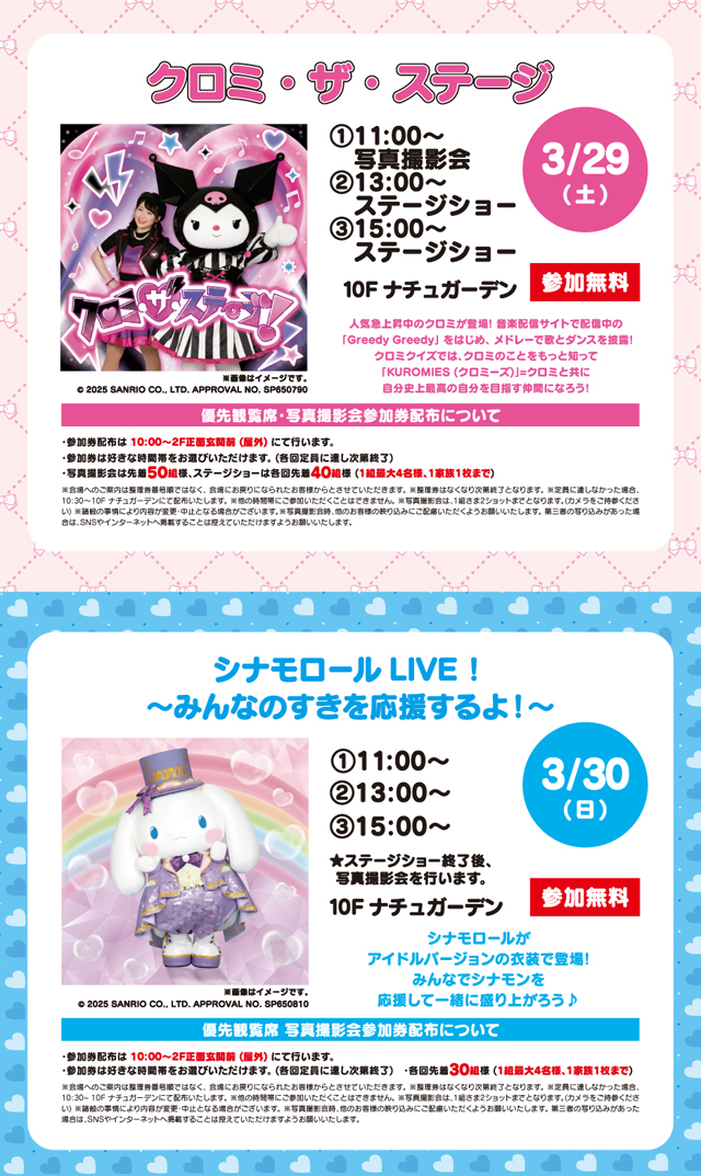 ・写真撮影会は先着50組、ステージショーは各回先着40組(1組最大4名、1家族1枚まで)
