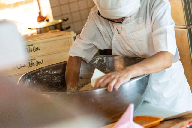 時間と力がいる大変な作業ですが、食感や小麦本来のおいしさを引き出すために、手間暇をかけて仕上げています。セ・トレボンが福岡平尾に創業して20年以上、創業当時よりフランスの伝統的な製法”手ごね”にこだわり、日々パンを作っています。