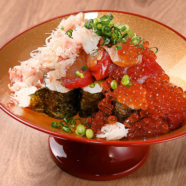 細巻き寿司の上に、カニ身、いくら、マグロ、とろろがたっぷり! 一口食べたら止まらない美味しさ。 色々な海鮮の味が重なり合い、至福のハーモニーを生み出します。
