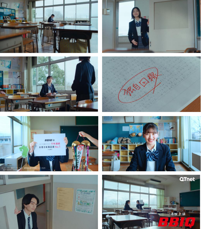 一見、クラスメイトに励まされながら勉強を頑張る、高校生の青春のワンシーンを描いたエモーショナルな物語なのかと思いきや、突然人が変わったように、BBIQ と QT モバイルのサービスについて説明をはじめるクラスメイトの様子が面白いインパクトを与えてくれる、一風変わったムービーとなっております。
