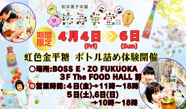 福岡PayPayドーム横の、BOSS E・ZO FUKUOKA 3F(福岡市中央区地行浜2-2-6)3Fにて、恋寿華堂カフェ工房「虹色金平糖 瓶詰め体験」が開催されます。