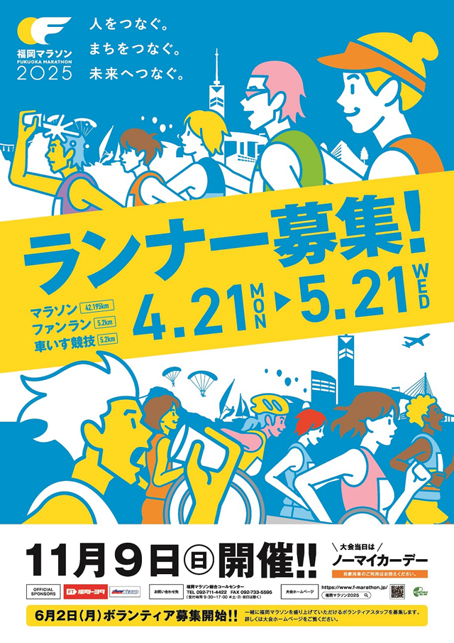 福岡マラソン2025の参加ランナーを2025年4月21日(月)より募集します。フルマラソンの定員は前回より1,000人増の13,000人となりました。申込締切は5月21日(水)です。