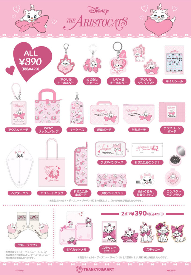 ディズニー映画『おしゃれキャット』より、ピンクリボンをつけたキュートな子ネコ「ディズニー マリー」の限定アイテム。ベビーピンクでまとめたガーリーな全26アイテムをラインナップ!