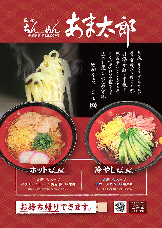 「ちんめん」とは、ちゃんぽんでもうどんでもラーメンでもない、「あま太郎」オリジナルの全く新しい麺です。持ち帰り用の麺とスープを販売しています。