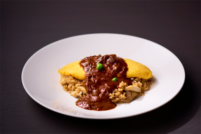 半熟のオムレツに、濃厚で深みのあるハッシュドビーフソースを合わせました。上品なバターの香りとチキンの旨み、玉ねぎの甘みが絶妙なチキンライスが味わいを一層引き立てます。