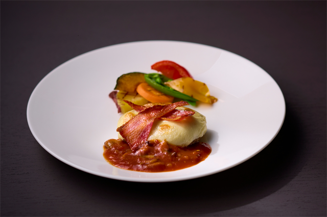 裏ごししたグリーンピースを蒸し、上に小海老を添えた冷製の洋風茶碗蒸しです。クリーミーで滑らかな食感が広がり、グリーンピース本来の自然な甘みがほんのりと感じられる、爽やかな一品に仕上げました。