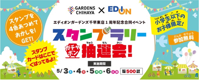 ガーデンズ千早、ちはや公園、エディオンガーデンズ千早東店内に設置された、4 つスタンプを集めてガチャポン抽選会に参加できます。イベントを楽しみながら、ガーデンズ千早全館まわって、お菓⼦の詰め合わせをゲットしよう!
