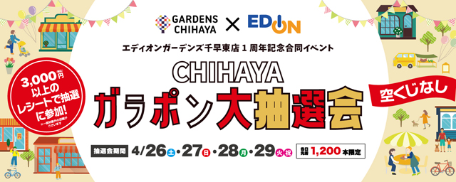 ガーデンズ千早、ちはや公園、エディオンガーデンズ千早東店での買い物レシート3,000円(税込/合算可)ごとに1回、ガラポン抽選会に参加できます。