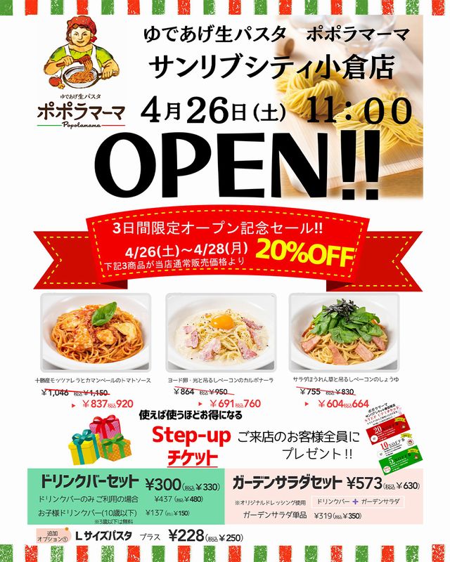 2025年4月26日(土)ゆであげ生パスタ「ポポラマーマ サンリブシティ小倉店」(北九州市小倉南区上葛原2-14-1)がオープン。