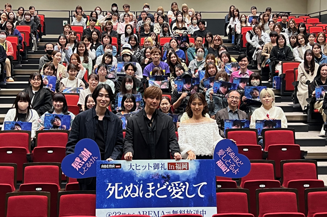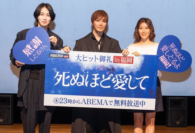2025年4月29日(火・祝)天神エルガーラホールにて、ABEMAオリジナルドラマ「死ぬほど愛して」大ヒット御礼プレミアイベント in 福岡が開催されました。約10年ぶりの福岡での舞台挨拶となる成宮寛貴さんと、ヒロインの瀧本美織さん、そして福岡出身 カルマさんの3人がファンの前に登場。