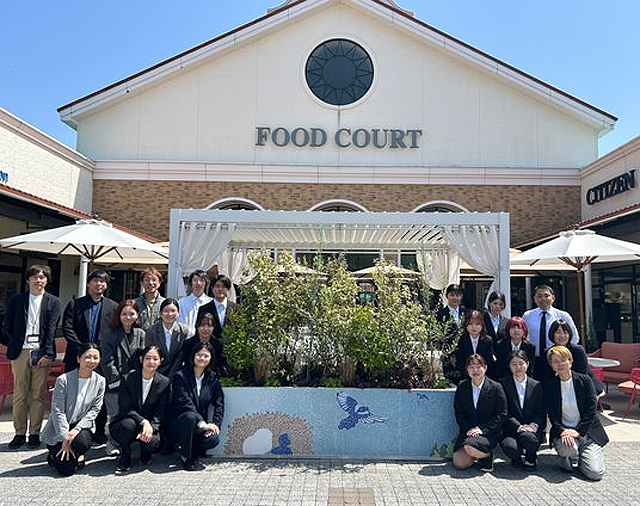 プロジェクトの最終回となった4月19日(土)は、鳥栖プレミアム・アウトレットに設置されたプランターが晴天のもとでお披露目され、学生達は自身が手掛けたデザインのプランターと一緒に笑顔で写真撮影したり、来場客がくつろいでいる空間に自身の作品が溶け込んでいる様子を見守りながら社員と共に感想を言い合うなど、半年間のプロジェクトを振り返りながら楽しみました。