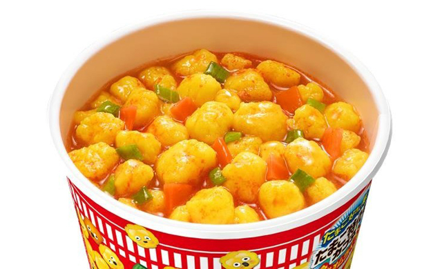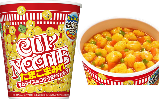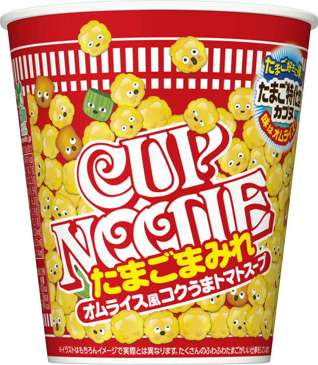 「カップヌードル たまごまみれ ビッグ」は、タマネギのうまみとバターの風味をきかせたトマトベースのスープが特長で、具材として通常品の約2倍量*のたまごを入れました。