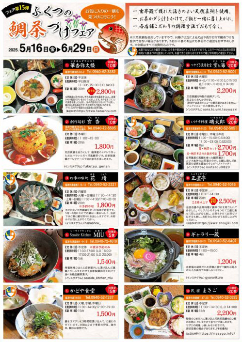 2025年5月16日(金)~6月29日(日)福津市内各所において、毎年恒例のグルメイベント「ふくつの鯛茶づけフェア」が開催されます!玄界灘の天然真鯛を各店こだわりの茶漬けで食べ比べ!