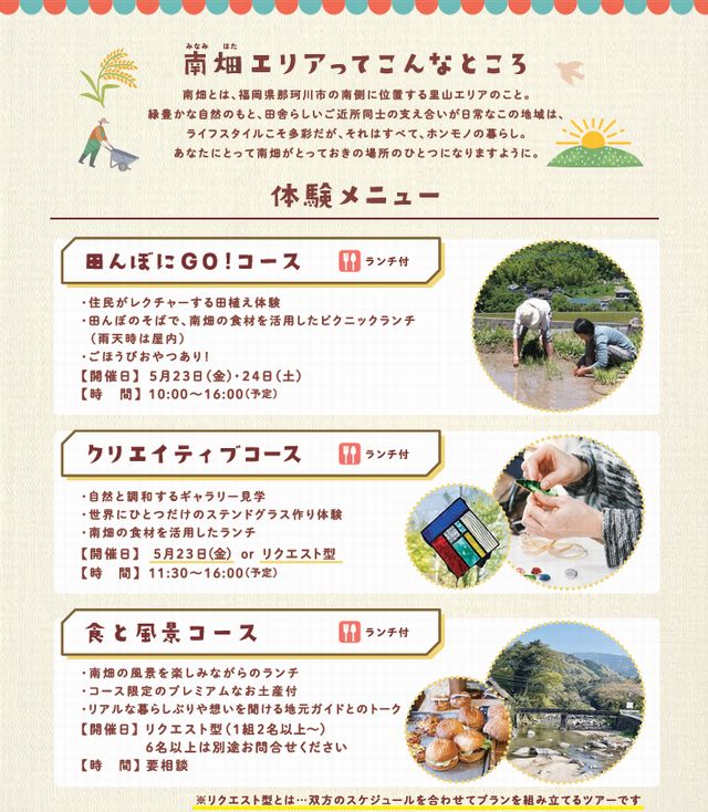 2025年5月23日(金)・5月24日(土)またはリクエスト型にて、南畑のホンモノにふれる少人数ツアー「南畑日和(みなみはたびより)」が開催されます。