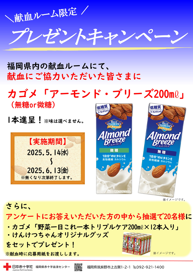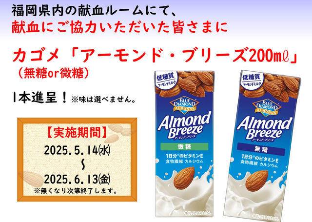 福岡県赤十字血液センターでは、2025年5月14日(水)~6月13日(金)、福岡県内の献血ルームで献血に協力した方全員に「カゴメ アーモンド・ブリーズ 200ml」(無糖 or 微糖)を1本プレゼントするキャンペーンを実施します。※なくなり次第終了。
