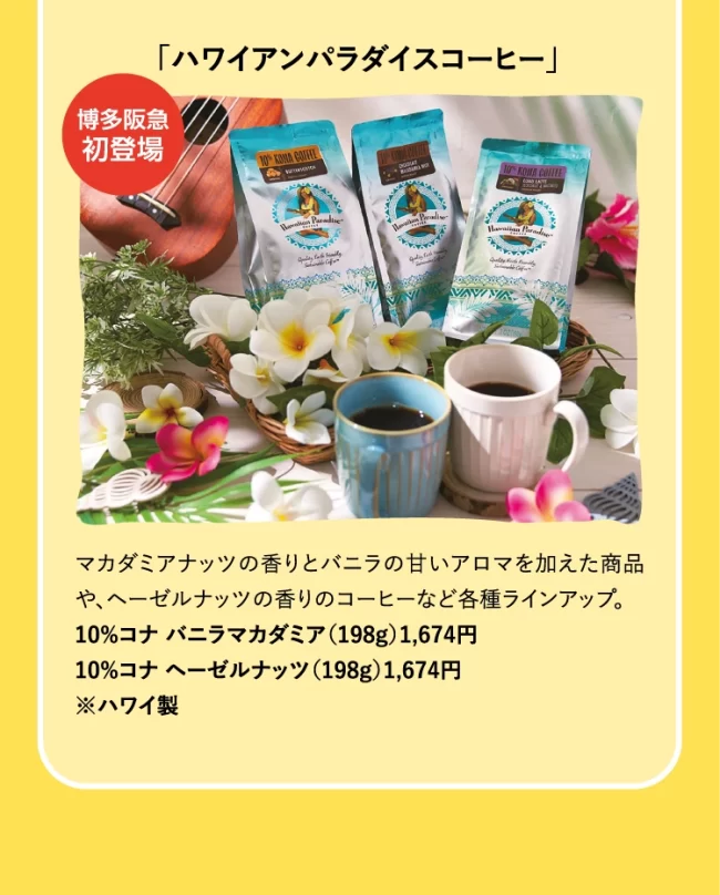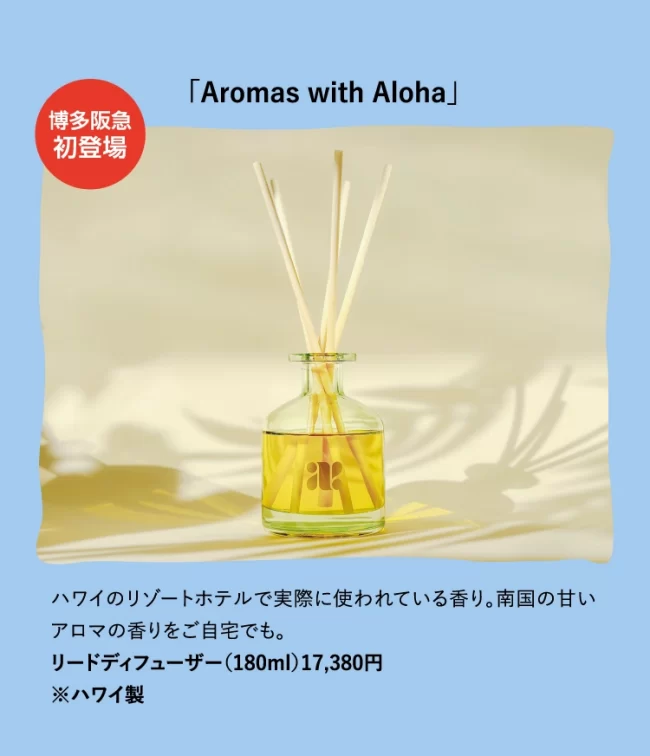 『博多でアロハ!』リゾート気分になれるアロハシャツ・ワンピースやインテリア、ロコモコやマラサダの食べ歩き、お土産にクッキーも。おうちで楽しめるコスメやフレグランスもラインナップ。ハワイ気分満点の6日間です。