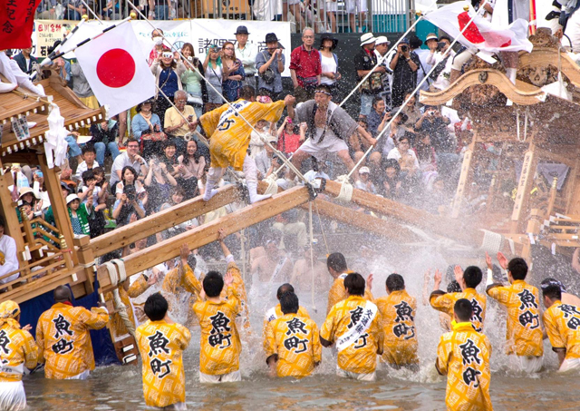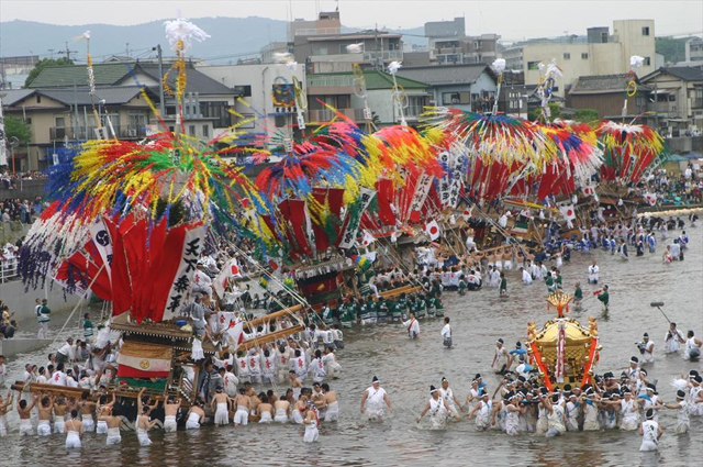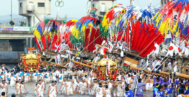 日本最大級の2基の神輿と11台の山笠が威勢よく町を練り歩き、彦山川を渡る「川渡り神事」は迫力満点です。