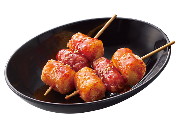 屋台のおやつで人気のソトクソトク。お餅とソーセージを甘辛ダレでどうぞ!