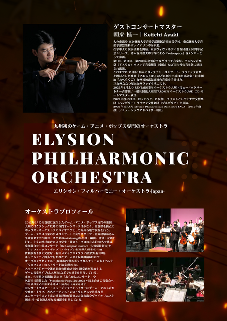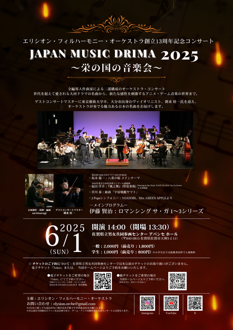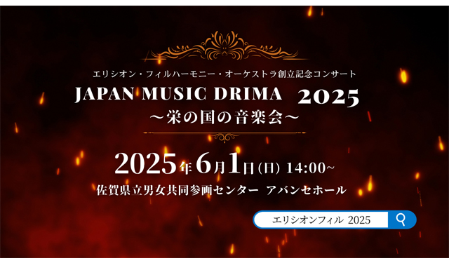 世代を超えて楽しめる、ゲーム・アニメ音楽をオーケストラで!エリシオン・フィルハーモニー・オーケストラ〈創立13周年記念〉公演「Japan Music Drima 2025~栄の国の音楽会~」を、2025年6月1日(日)14:00、佐賀県男女共同参画センター・アバンセホール(佐賀市天神3丁目2-11)で開催。