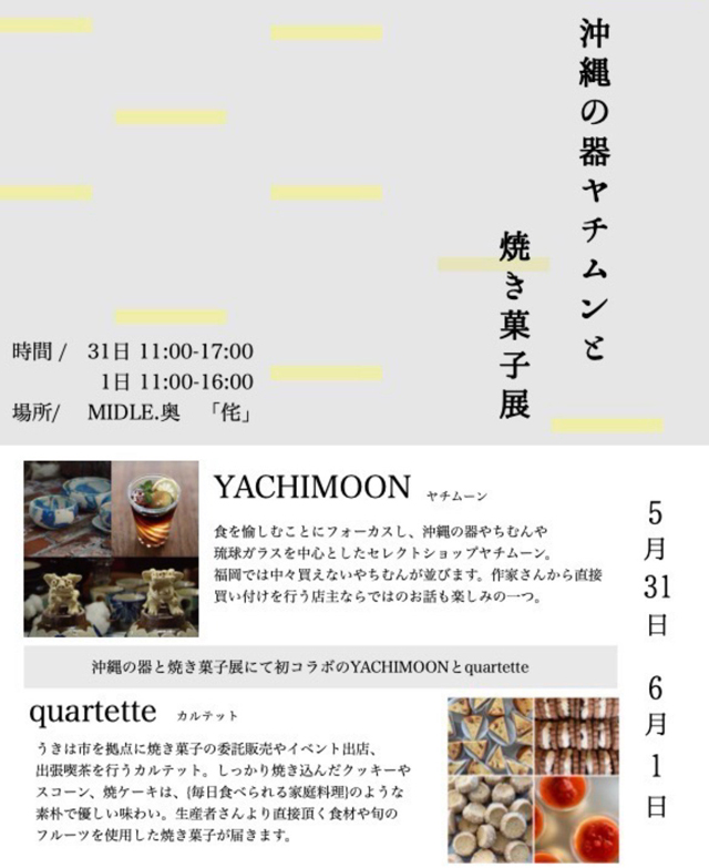 2025年5月31日(土)~6月1日(日)の2日間、太宰府市の土蔵ギャラリー侘(太宰府市宰府3-2-10/カフェMIDLE.奥)にてコラボイベント『沖縄の器やちむんと焼き菓子展』が開催されます。