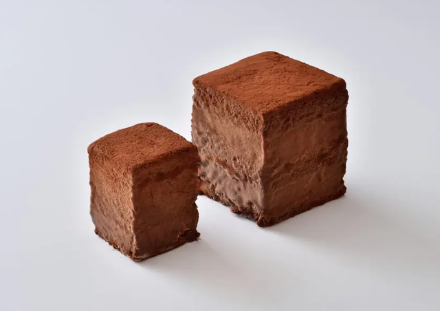 博多の石畳はチョコスポンジ・生クリーム・バニラスポンジ・チョコレートクリーム・チョコスポンジの5層構造からなり、チョコレートショップ・オリジナルのチョコレートをコーティングしたケーキです。