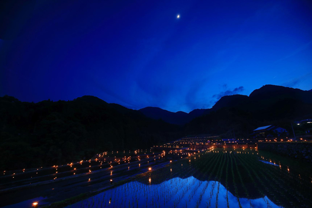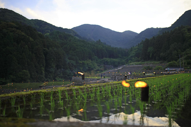 約400年の歴史がある竹地区の棚田は、「日本の棚田百選」に認定されています。当日は、田植えを終え、水が張られた約400枚の石組みの棚田に、約1,000本の手作りトーチを灯します。
