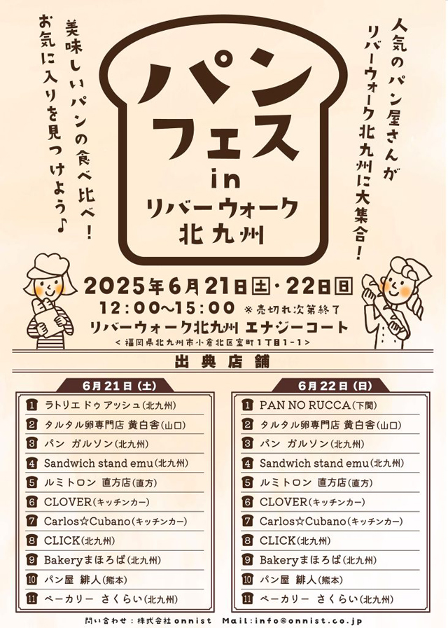 2025年6月21日(土)~6月22日(日)12:00~15:00(売り切れ次第終了)、リバーウォーク北九州(北九州市小倉北区室町1-1-1)1Fエナジーコートにて「パンフェス in リバーウォーク北九州」が開催されます。