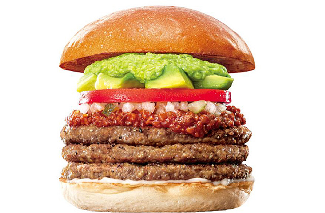 牛肉100%パティを贅沢に3枚重ね、食べ応えのある大きさにカットしたアボカドと、メキシコ産アボカドを使用したなめらかな食感のワカモレソースを合わせ、スパイシーなチリミートソースやスライストマトなどとともにふんわりもっちり食感のバンズで挟んだ商品です。