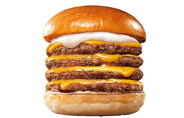 牛肉100%パティとレッドチェダーチーズを 4枚ずつ重ね、とろ~りチーズソースなどとともにふんわりもっちり食感が特長のバンズで挟みました。※「トリプル絶品チーズバーガー」は1,090円で販売。