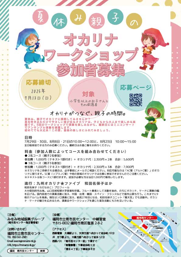参加費:1,000円(テキスト1部付き)+ オカリナ代:2,300円 × 2本 合計:5,600円