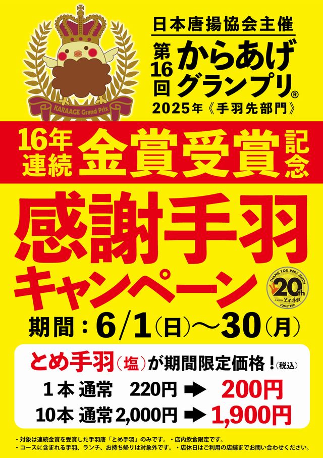 2025年6月1日(日)~6月30日(月)より、店内飲食限定で感謝キャンペーンを実施。とめ手羽 1本 220円→200円/10本 2,000円→1,900円に。