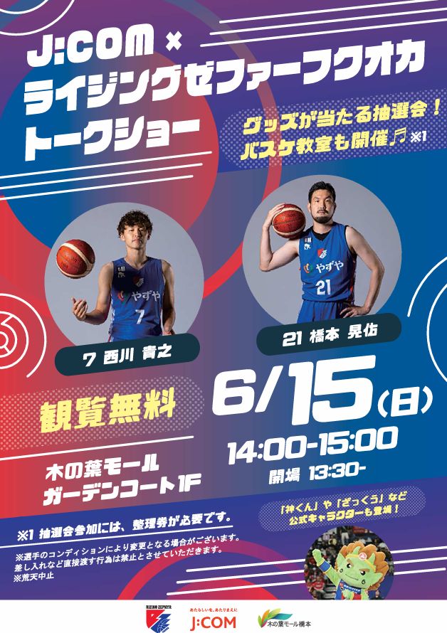 2025年6月15日(日)木の葉モール橋本(福岡市西区橋本2丁目27-2)ガーデンコート1Fにて 「J:COM×ライジングゼファーフクオカトークショー」が開催されます。観覧無料。
