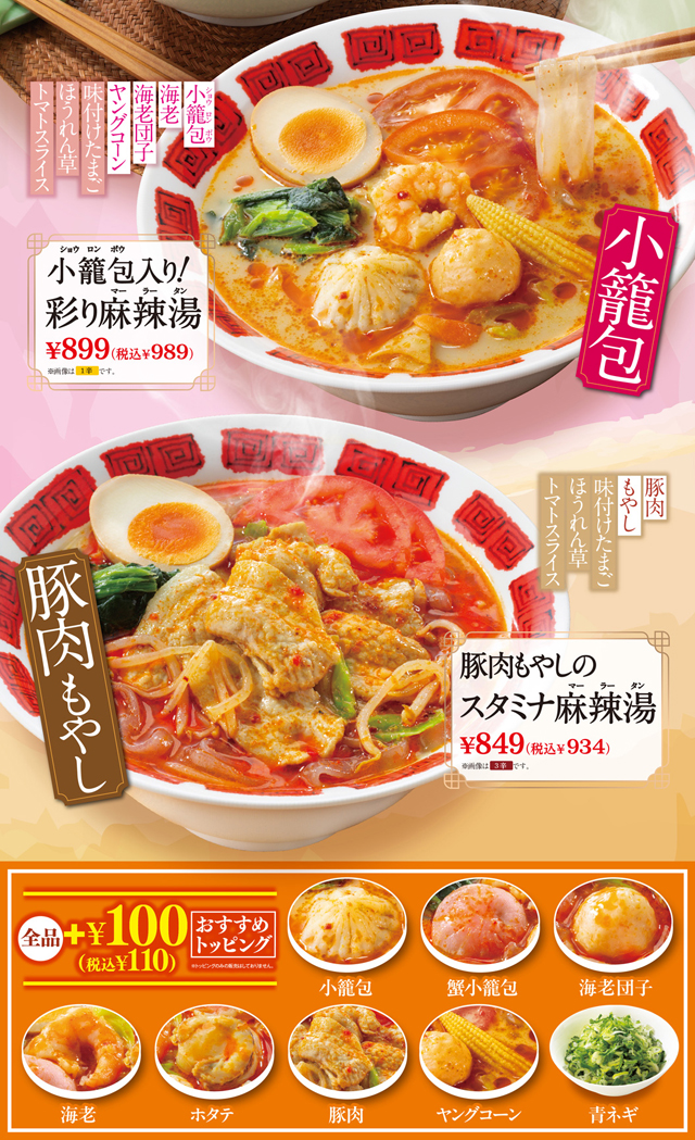登場から累計240万食の本格的な「麻辣湯(マーラータン)」が3種類にラインアップ拡充!蟹小籠包や海老・イカ・ホタテの“海鮮”と、スタミナがつく“豚もやし”の2種が新たに登場。その日の気分に合わせた好きな一杯を選べます。