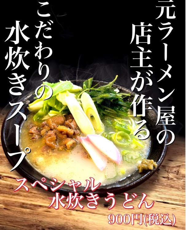 元ラーメン屋店主が作る、こだわりの水炊きスープ「スペシャル水炊きうどん」900円(税込)。