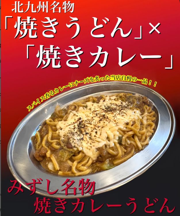 北九州名物「焼きうどん」×「焼きカレー」、こだわりのカレーうどんを「焼きうどん」に!とろけるチーズを炙った自慢の一皿です。