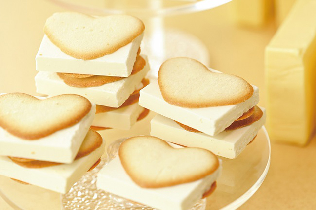 スクエアチョコレートに発酵バターを21%配合したハート型ラングドシャでサンド。くちどけの良いチョコレートと発酵バターをたっぷり練りこんだラングドシャの相性が抜群です。