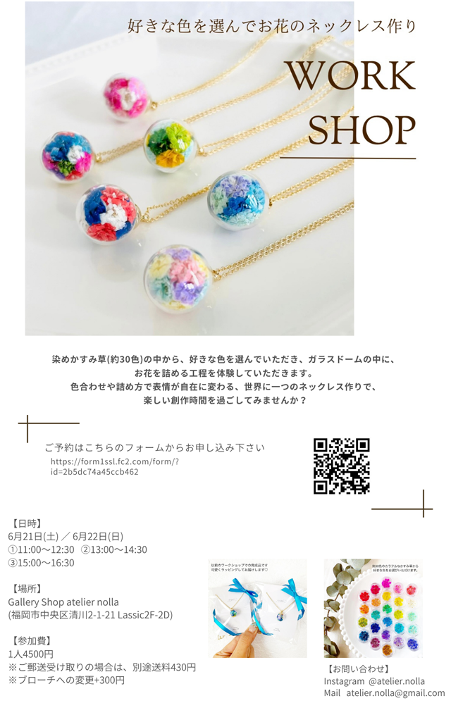 福岡市中央区清川の「Gallery Shop atelier nolla」(福岡市中央区清川2-1-21若鶴マンションLassic2F-2D)にて、2025年621日(土)~6月22日(日)の2日間、初の大人向けワークショップ「好きな色を選んでお花のネックレス作り」を開催します。