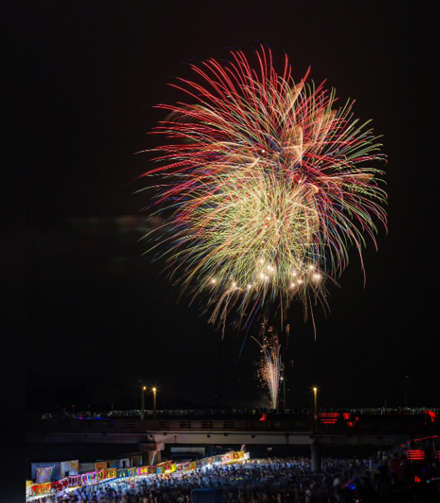 約3,000初の花火が宮若の夜空を彩る夏の風物詩。53回を数える歴史ある花火大会です。当日は多くの屋台が並びお祭りを楽しむことができます。