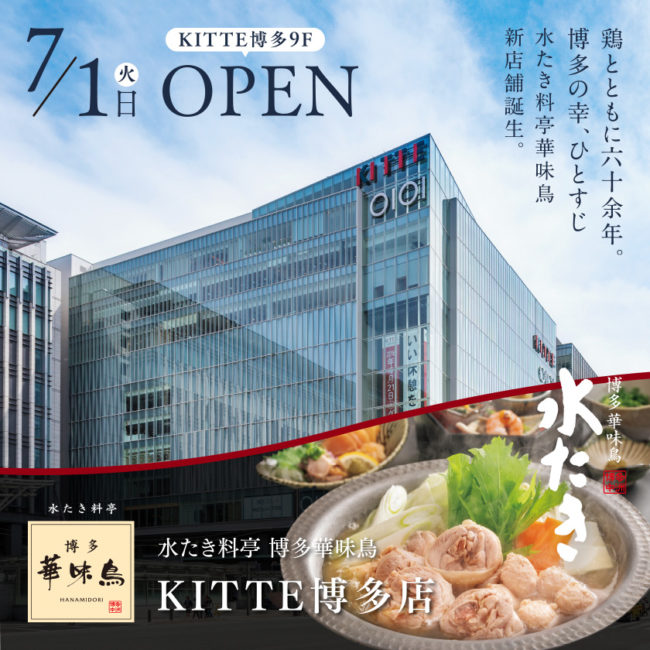 2025年7月1日(火)「水たき料亭 博多華味鳥 KITTE博多店」(福岡市博多区博多駅中央街9-1-9F)がオープンします。営業時間は11:00~23:00(ランチタイム 11:00~15:00)。