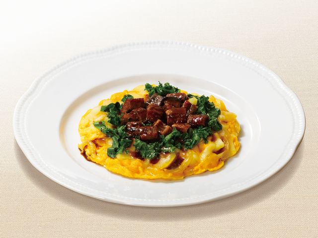チーズときたあかり、タマネギのオープンオムレツに、ケールとうなぎのきざみをのせ、日本ワイン「山梨マスカット・ベーリーA」と山椒を合わせたオリジナル赤ワインソースで仕上げました。レモンと炭酸を合わせたすっきりとした飲み口のスプリッツァーやスプリッツァールージュ、日本ワイン等のドリンクとのペアリングがおすすめです。