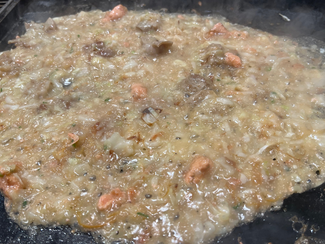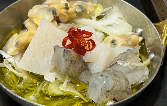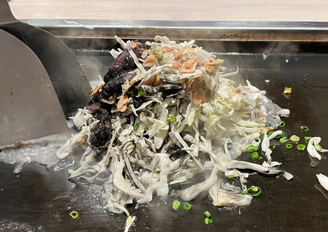 約30種類のメニューからベースのだしに合わせてもんじゃ焼きを選ぶと、スタッフが目の前で美味しく焼き上げます。なかでもおすすめは、塩ちゃんこだしをベースにした豪華な「デラックス海鮮ちゃんこもんじゃ」です。