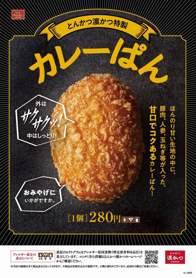 「とんかつ濵かつ」では、2025年6月23日(月)より一部店舗にて、とんかつ濵かつ特製「カレーパン」の販売を開始しました。サクサク・しっとりな食感、ありそうでなかった「カレーパン」(1個280円)。