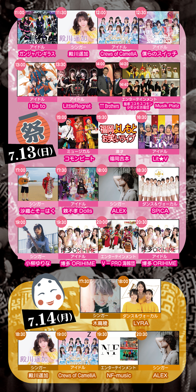 国内外から多くの観光客の皆様が集まる「博多祇園山笠」。その醍醐味を味わいながら、地元福岡・九州の名物グルメを食し、地元で活躍するシンガーやアイドル、エンターテインメントのパフォーマンスを堪能できる屋外イベント「博多山笠夏祭り2025」。