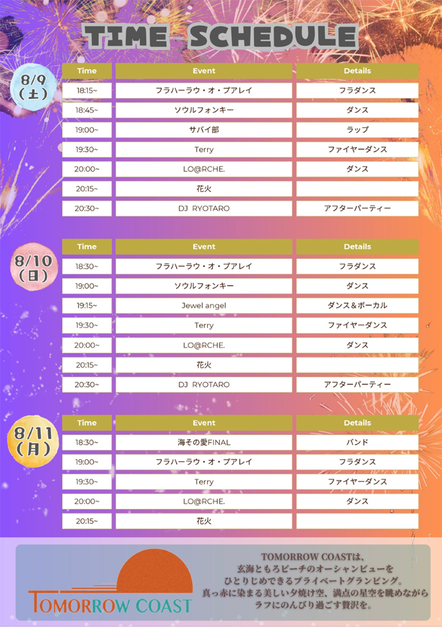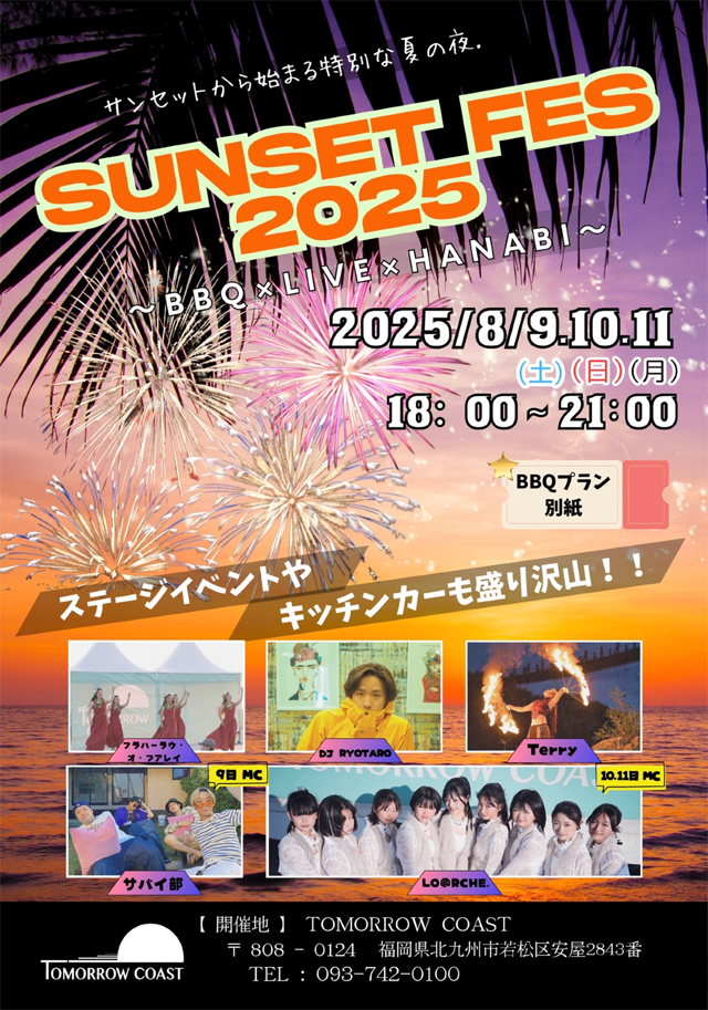 2025年8月9日(土)~8月11日(月)18:00~21:00、TOMORROW COAST(北九州市若松区安屋2843番)にて「SUNSET FES 2025 ~BBQ×LIVE×HANABI~」が開催されます。