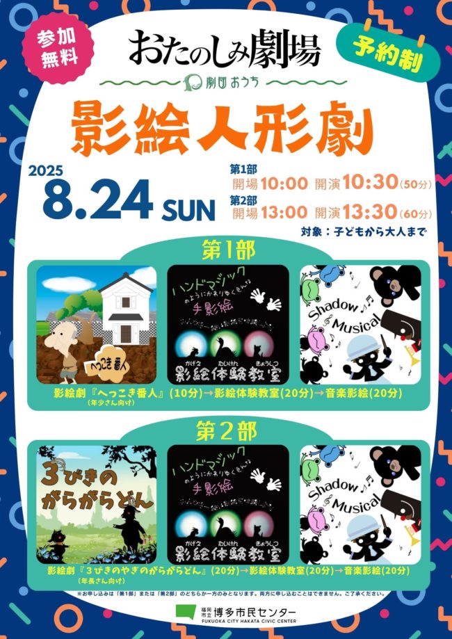 2025年8月24日(日)博多市民センター(福岡市博多区山王1-13-10)にて「おたのしみ劇場 影絵人形劇」が開催されます。参加無料(事前予約制)。