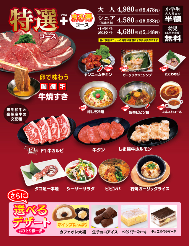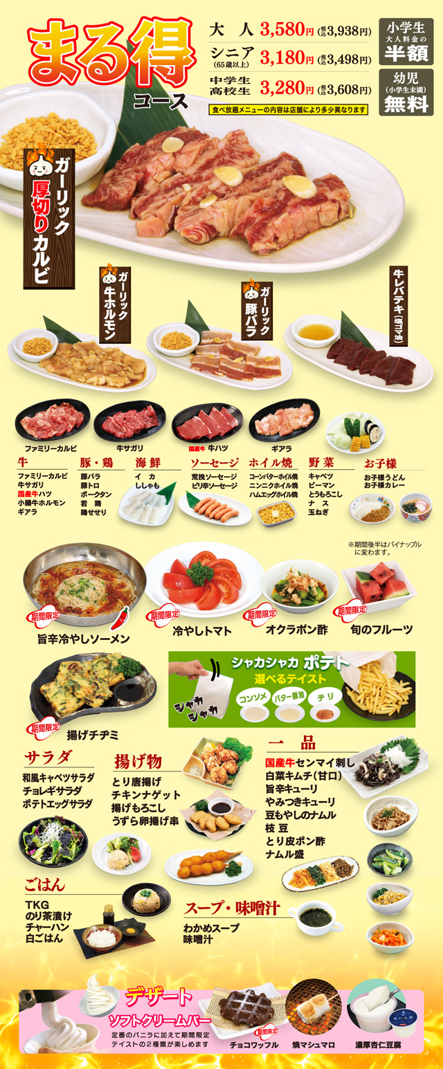 まる得食べ放題は、大人3,938円(税込)、シニア(65歳以上)3,498円(税込)、中学・高校生3,608円(税込)、小学生は大人料金の半額、幼児(小学生未満)は無料となっています。