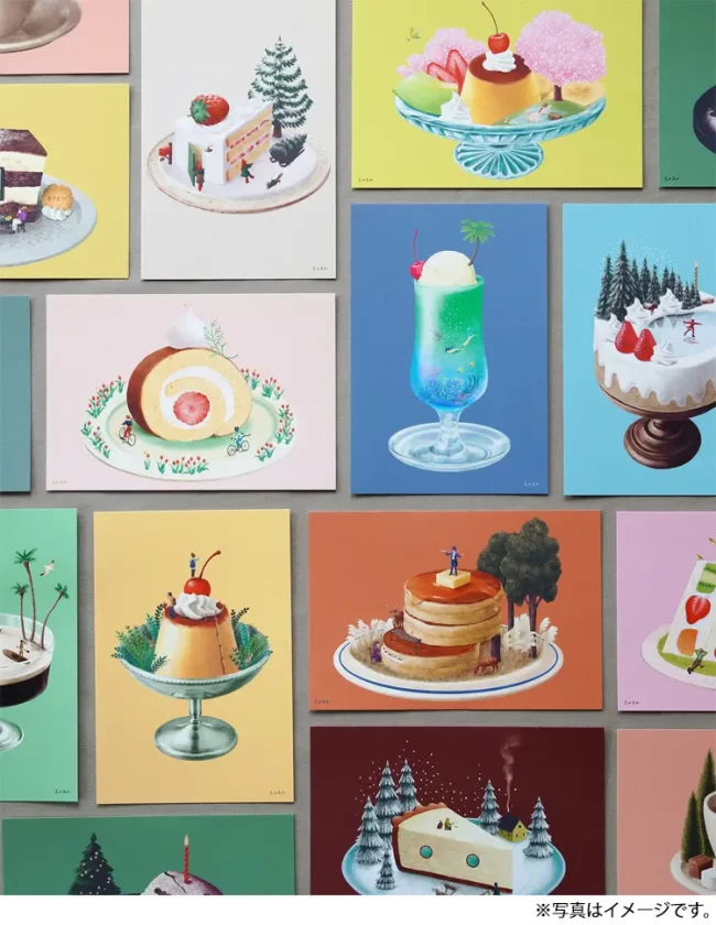 『スイーツの中に小さな季節を閉じ込めたイラストをポストカードやカードにしました。甘い毎日をお届けします。』