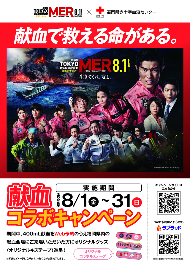 福岡県赤十字血液センターでは、2025年8月1日(金)公開の映画 劇場版『TOKYO MER ~走る救急救命室~南海ミッション』とコラボし、400mL献血をWeb予約のうえ、福岡県内の献血会場に来場した方を対象としたキャンペーンを実施します。