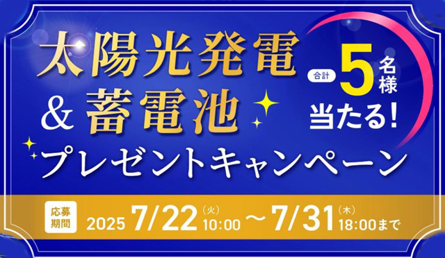 応募期間は2025年7月22日(火)~7月31日(木)18:00まで、太陽光発電&蓄電池プレゼント「ゆめソーラー 夏の大感謝祭」開催。