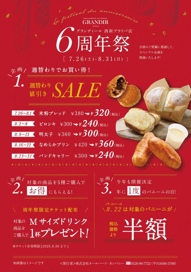 2025年7月26日(土)〜8月31日(日)の期間中、週替わりで「グランディール」の人気商品『米粉ブレッド』や『明太子』をはじめとした全5品の値引SALEを開催!